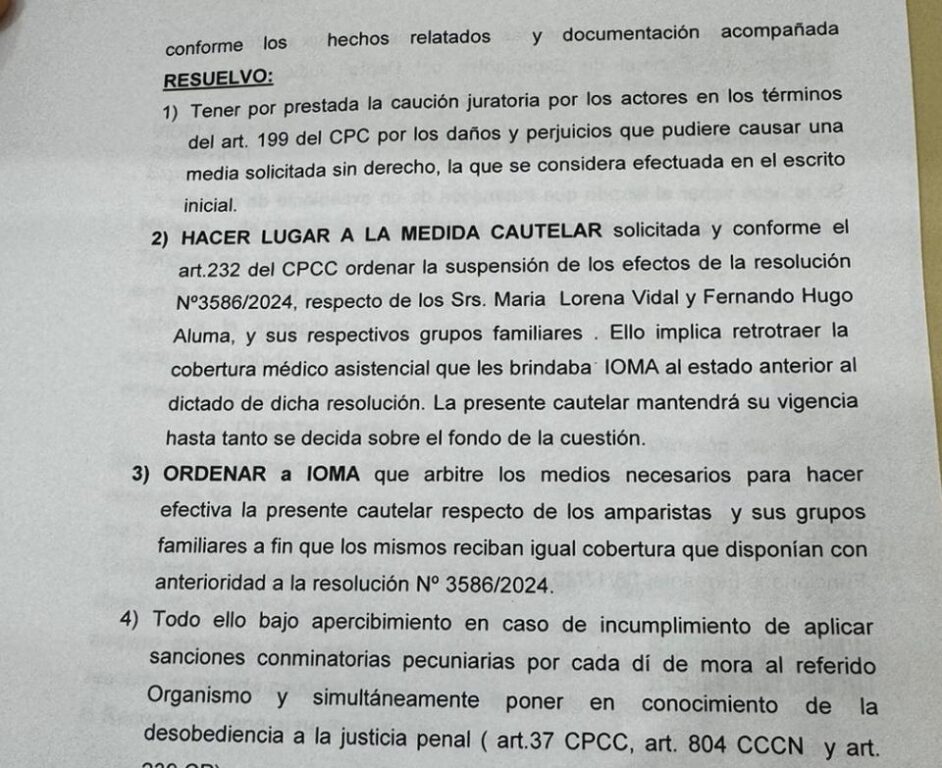 2- Hacer lugar a la medida cautelar solicitada y conforme el art. 232 del CPCC ordenar la suspensión de los efectos de la resolución 3586/2024, respecto a los señores María Lorena Videla y Fernando Hugo Alumá, y a sus respectivos grupos familiares. Ello implica retrotraer la cobertura médico asistencial que les brinda IOMA al estado anterior al dictado de dicha resolución. La presente cautelar mantendrá su vigencia hasta tanto se decida sobre el fondo de la cuestión.