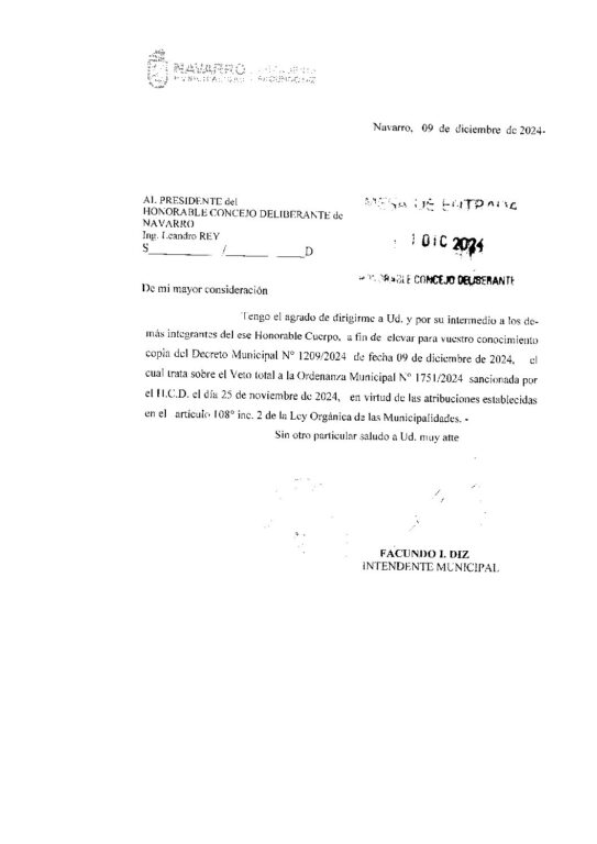 Tengo el agrado de dirigirme a ud. y por su intermedio a los demás integrantes de ese Honorable Cuerpo, a fin de elevar para vuestro conocimiento copia del Degreto Municipal Nº 1209/2024 de fecha 9 de diciembre de 2024, el cual trata sobre el Veto total a la Ordenanza Municipal No 1751/2024 sancionada por el H.C.D. el día 25 de noviembre de 2024, en virtud de las atribuciones establecidas en el artículo 108 inc. 2 de la ley orgánica de las municipalidades.