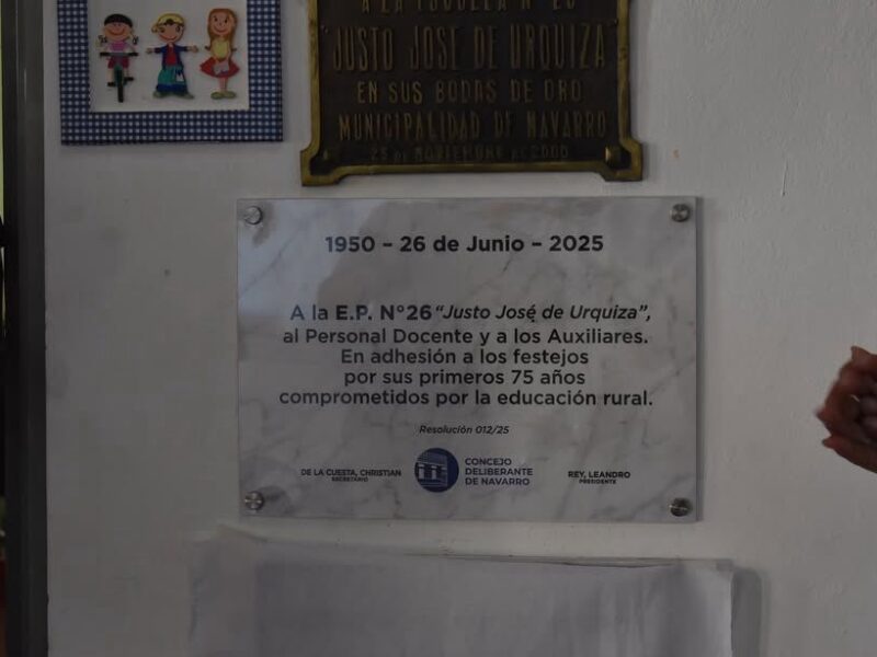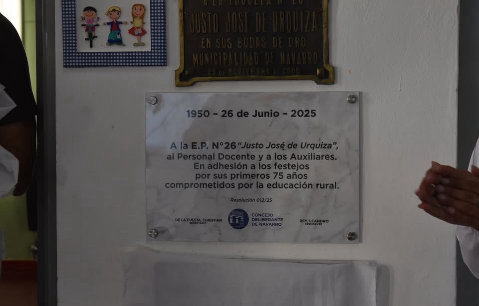 El Honorable Concejo Deliberante estuvo presente en el acto conmemorativo por el 75° Aniversario de la fundación de la Escuela Primaria N° 26 «Justo José de Urquiza», realizado el pasado viernes. En su representación estuvieron, el Pte. Leandro Rey, el Secretario Christian de la Cuesta y la Concejal Lorena Maurer, quienes entregaron copia certificada de la Resolución Nº 012/25 y descubrieron la placa conmemorativa en la que el Honorable Concejo Deliberante de Navarro, declara de “Interés Social y Municipal” dicho festejo.