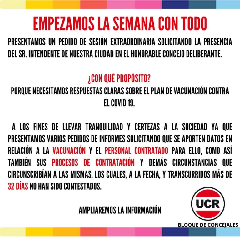 A los fines de llevar tranquilidad y certezas a la sociedad, ya que presentamos varios pedidos de informes solicitando que se aporten datos en relación a la vacunación y el personal contratado para ello, como así también sus procesos de contratación y demás circunstancias que circunscribían a las mismas, los cuales, a la fecha, y transcurridos más de 32 días no han sido contestados.