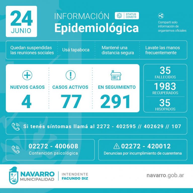 Hace minutos, recibimos en nuestra mesa de trabajo, el informe oficial con el estado de situación del COVID 19 en nuestra ciudad a la fecha. Del mismo se desprende que hubo 11 recuperados. Hubo además, 4 nuevos casos. De este modo, se registró un nuevo descenso en los casos activos, llegando a 77.