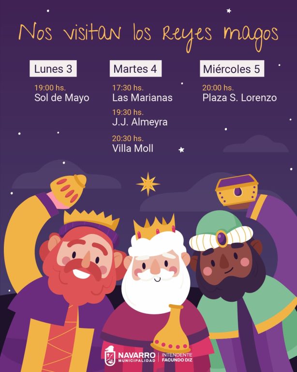 Este lunes a las 19:00 horas, Melchor, Gaspar y Baltazar estarán visitando Sol de Mayo, en tanto que el martes 4 harán lo propio en Las Marianas (17:30); J.J Almeyra (19:30) y Villa Moll (20:30). El recorrido de los reyes culmina el miércoles 5 de enero en la plaza San Lorenzo a las 20 horas.