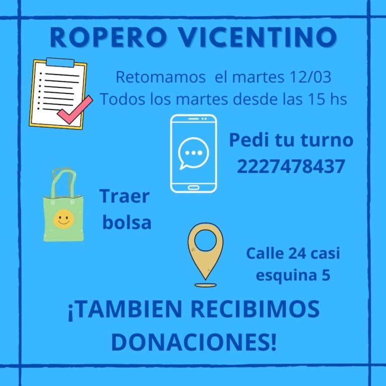 El Ropero Vicentino retoma sus actividades el próximo martes 12 de marzo en calle 24 casi esquina 5. Estará abierto los días martes desde las 15. Se puede solicitar turno al 2227 478437. Se ruega que concurran con bolsa.