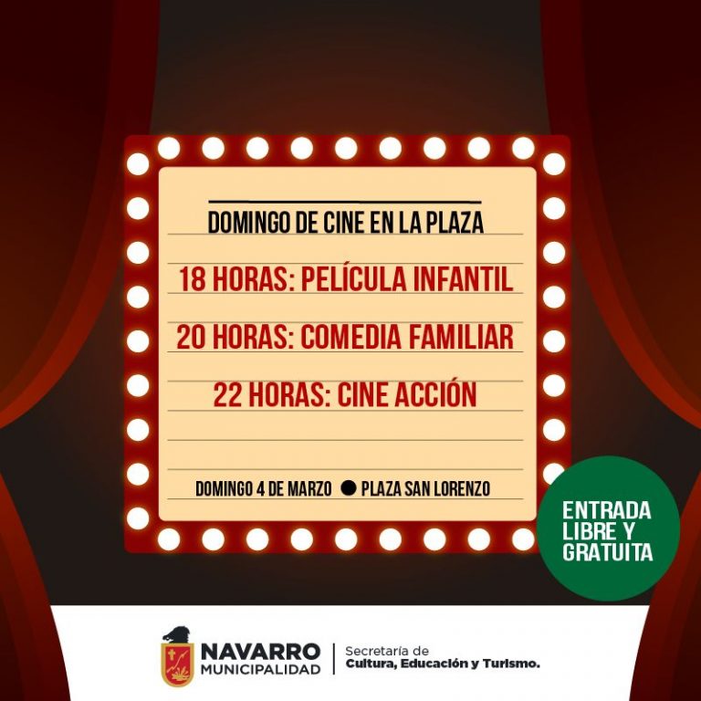La Secretaría de Cultura, Educación y Turismo te invita a disfrutar de un domingo de cine en la plaza San Lorenzo. El día 4, a partir de las 18, se proyectará una película infantil, luego a las 20, una comedia familiar y posteriormente, a las 22, una película de acción.