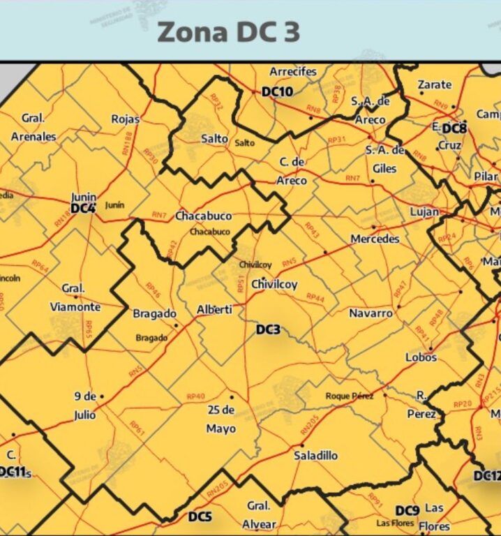 A lo largo de toda la jornada del miércoles se espera que los municipios en amarillo (entre ellos Navarro) sean afectados de oeste a este por vientos del sector sur, con velocidades de entre 40 a 60 km/h. y con ráfagas que podrían superar los 75 km/h.