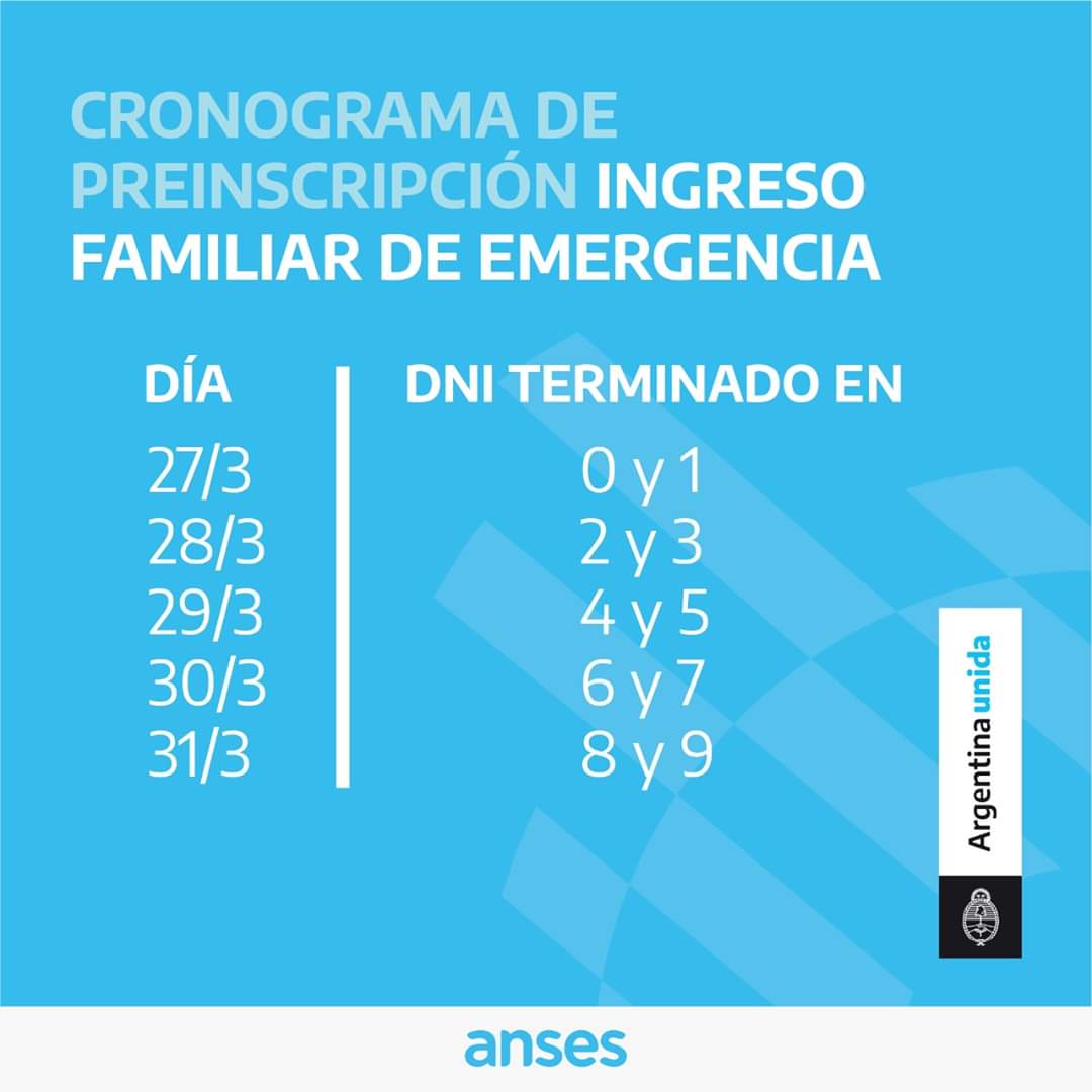 La ANSES informa que ya se ha establecido un cronograma para que los beneficiarios del Ingreso Familiar de Emergencia (IFE) puedan comenzar a pre-inscribirse de acuerdo con sus números de DNI a partir del próximo viernes 27 de marzo.