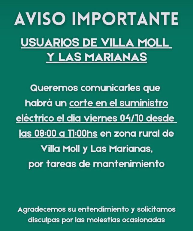 El día viernes 4/10 desde las 8 y hasta las 11 habrá un corte de suministro eléctrico en la zona rural de Villa Moll y Las Marianas por tareas de mantenimiento.