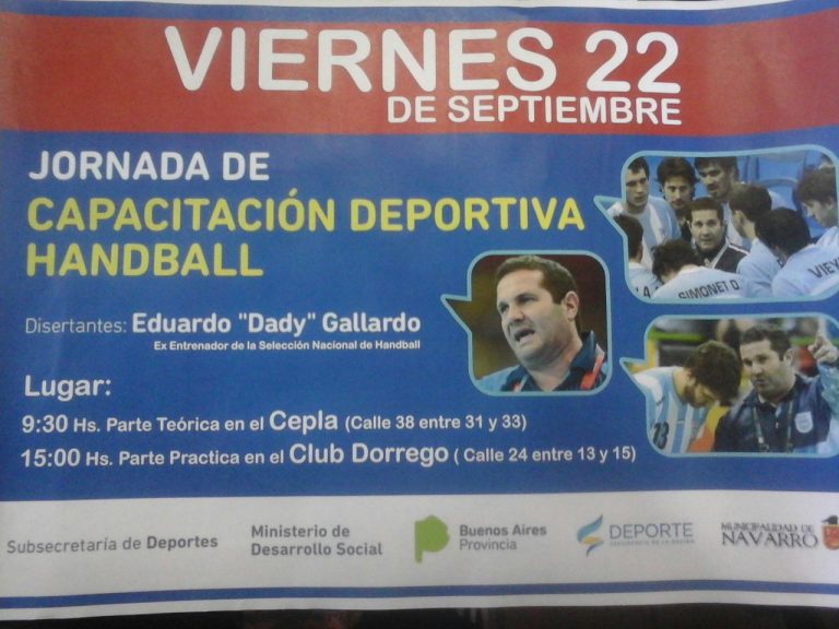 La Dirección de Deportes informa que este viernes se desarrollará una Jornada de Capacitación Deportiva, en este caso de Handball. El disertante será Eduardo «Dady» Gallardo, Ex Entrenador de la Selección Nacional de Handball. A las 9,30 será la parte teórica en el CEPLA, y a las 15, será la parte práctica en el Club […]