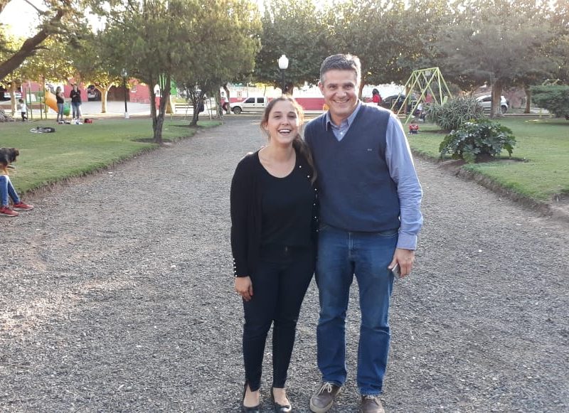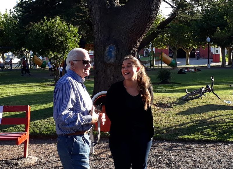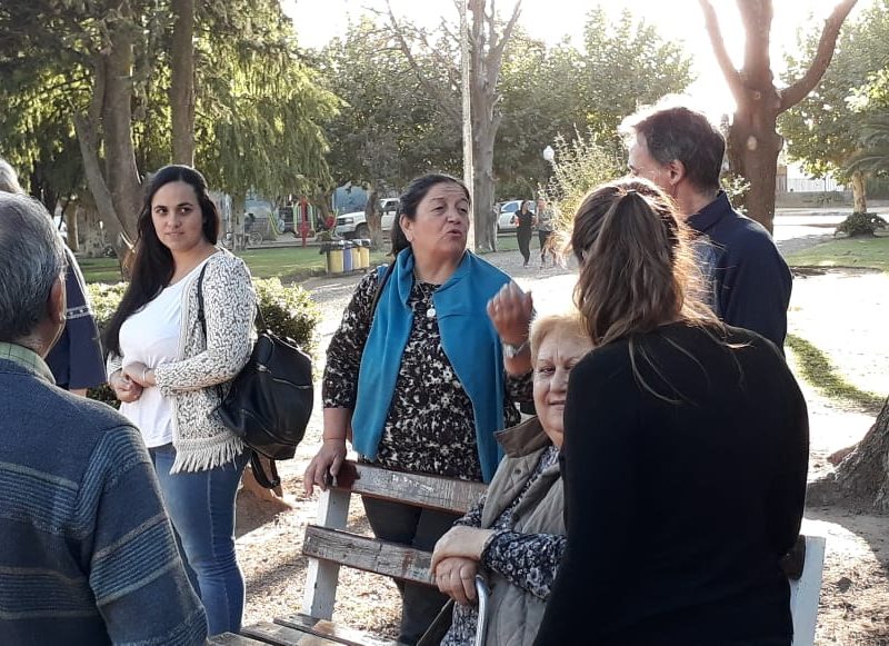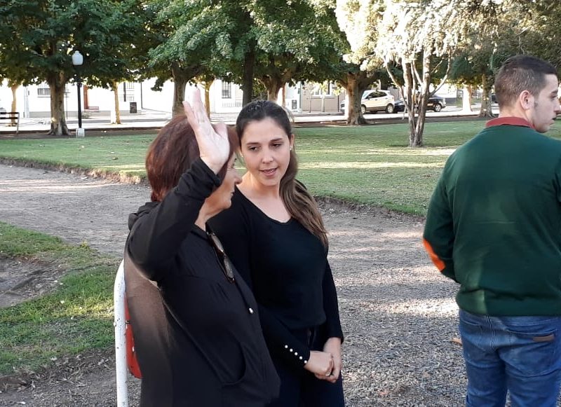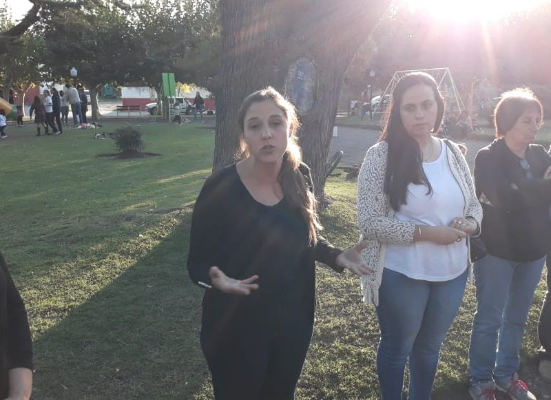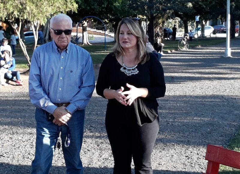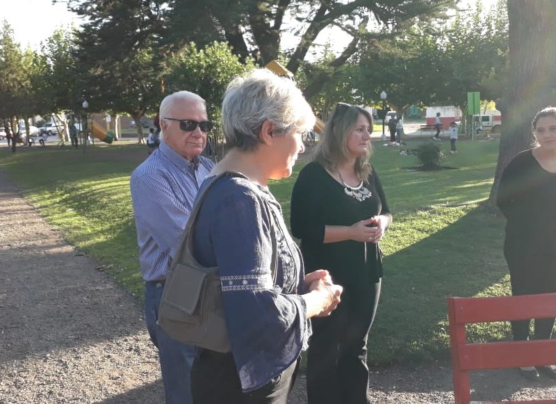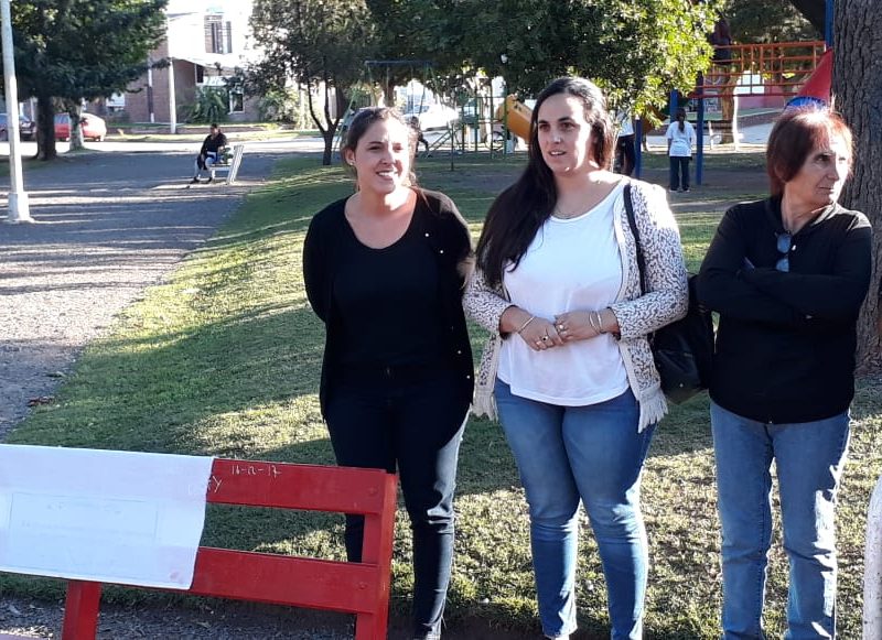 Banco rojo en la Plaza Dorrego. Acto de inauguración con presencia de la diputada Barbieri