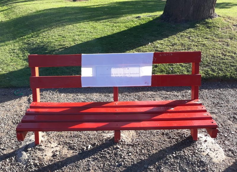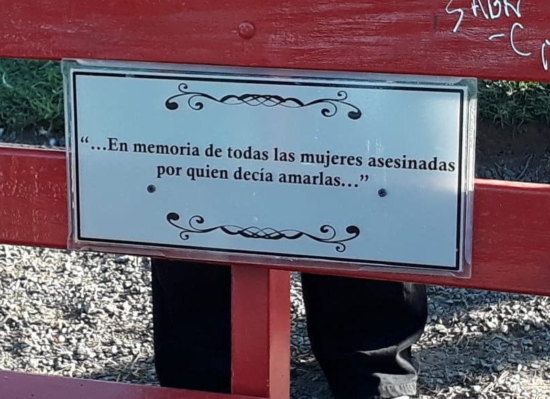 El banco posee un letrero en su parte central que expresa lo siguiente» En memoria de todas las mujeres asesinadas por quien decía amarlas».