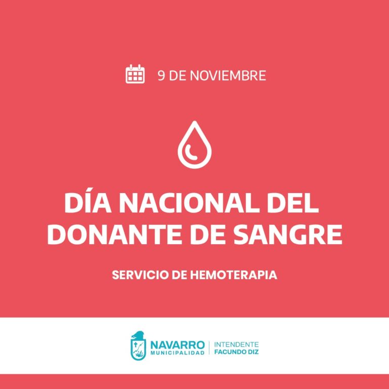 El equipo de hemoterapia del Hospital Municipal San Antonio de Padua informa qué, el 9 de noviembre es el «Dia Nacional del Donante de Sangre», y para conmemorarlo se realizará una campaña de donación de sangre el mismo 9 en el nosocomio y los días 16, 17 y 18 en la plaza San Lorenzo de Navarro desde las 8 de la mañana.