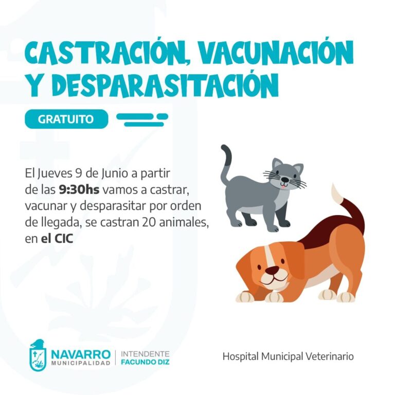 Mañana, jueves 9 de junio, el hospital municipal veterinario estará realizando castraciones, desparasitaciones y vacunando mascotas en el C.I.C. (calle 46 esquina 27) a partir de las 9.30. Será por orden de llegada y se atenderán a 20 mascotas de manera gratuita. Así la informaron desde la oficina de prensa municipal.