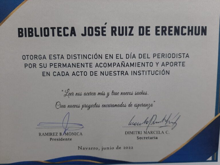 En la oportunidad de la presentación ante los medios en su sede, de los libros adquiridos recientemente en la Feria del Libro, la Biblioteca Pública y Popular José Ruiz de Erenchun, entregó a los informadores presentes, una distinción por el acompañamiento permanente para con dicha entidad. Desde ya, nuestra gratitud por tan sincero gesto.