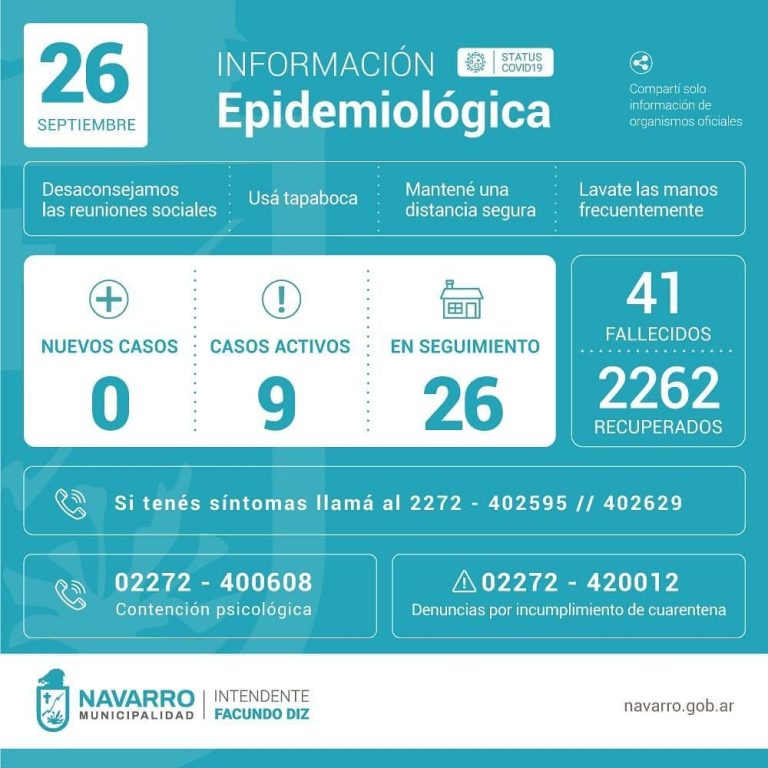 COVID 19. Situación en Navarro al 26/09. No hubo nuevos casos. Quedan 9 activos