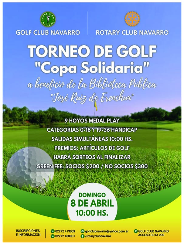Una inmejorable oferta para colaborar con una de las instituciones más queridas de nuestra ciudad como la Biblioteca Pública y Popular José Ruiz de Erenchun. Además, obviamente se podrá jugar golf y pasar un grato momento en este hermoso lugar; el predio del Navarro Golf Club. La cita es el domingo 8 de abril a