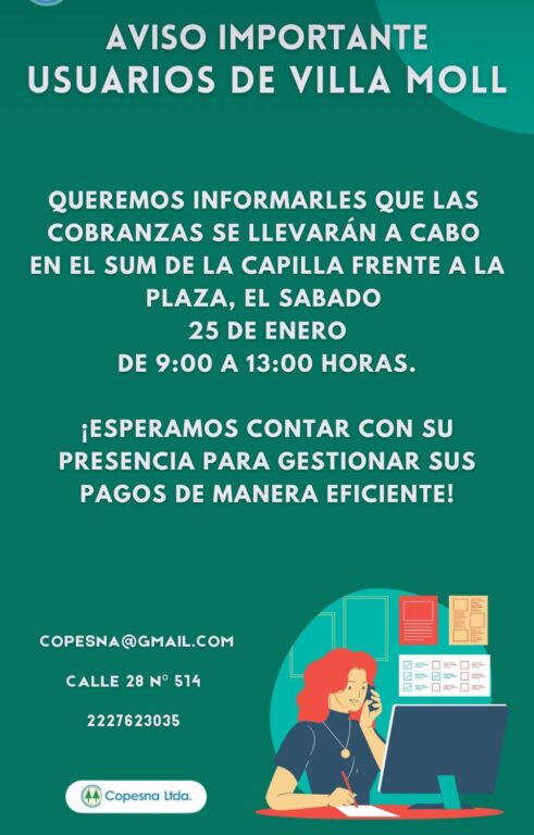 Queremos informarles que las cobranzas se llevarán a cabo en el SUM de la Capilla frente a la plaza, el sábado 25 de enero de 9 a 13. Esperamos contar con su presencia para gestionar sus pagos de manera eficiente. CO.P.E.S.N.A. Ltda.