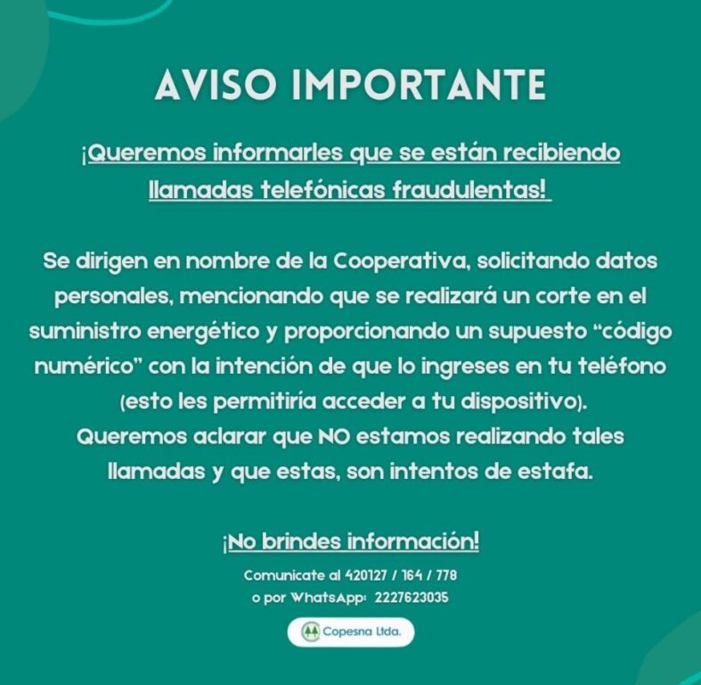 Hemos detectado llamadas fraudulentas en las que se hacen pasar por nuestra cooperativa eléctrica. Estas llamadas solicitan información personal y ofrecen un «código numérico», esto les permitiría acceder a tu teléfono.