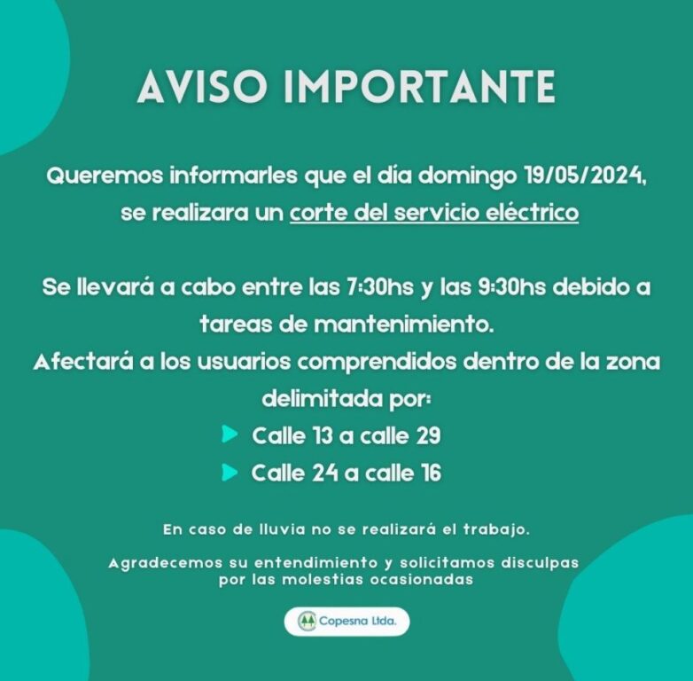 Queremos informarles que el día domingo 19/05/2024 se realizará un corte del servicio eléctrico. Se llevará a cabo entre las 7,30 y las 9,30 debido a tareas de mantenimiento. Afectará a los usuarios comprendidos dentro de la zona delimitada por: Calle 13 a calle 29 Calle 24 a calle 16 En caso de lluvia no […]