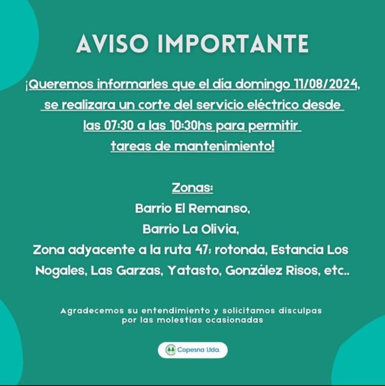 Queremos informarles que el día domingo 11/08/2024 se realizará un corte del servicio eléctrico desde las 7,30 a las 10,30 para permitir tareas de mantenimiento. Zonas: Barrio Del Remanso – Barrio La Olivia – zona adyacente a la ruta 47 – rotonda – Estancia Los Nogales – Las Garzas – Yatasto – Gonzalez Risos. Agradecemos […]