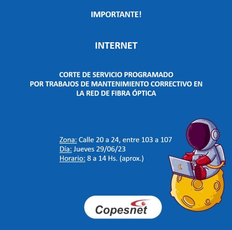 COPESNA informa que este jueves 29, en el horario de 8 a 14 aproximadamente, habrá un corte de servicio programado por trabajos de mantenimiento correctivo en la red de fibra óptica. El mismo se efectuará en la zona de calle 20 a calle 24 entre 103 y 107.