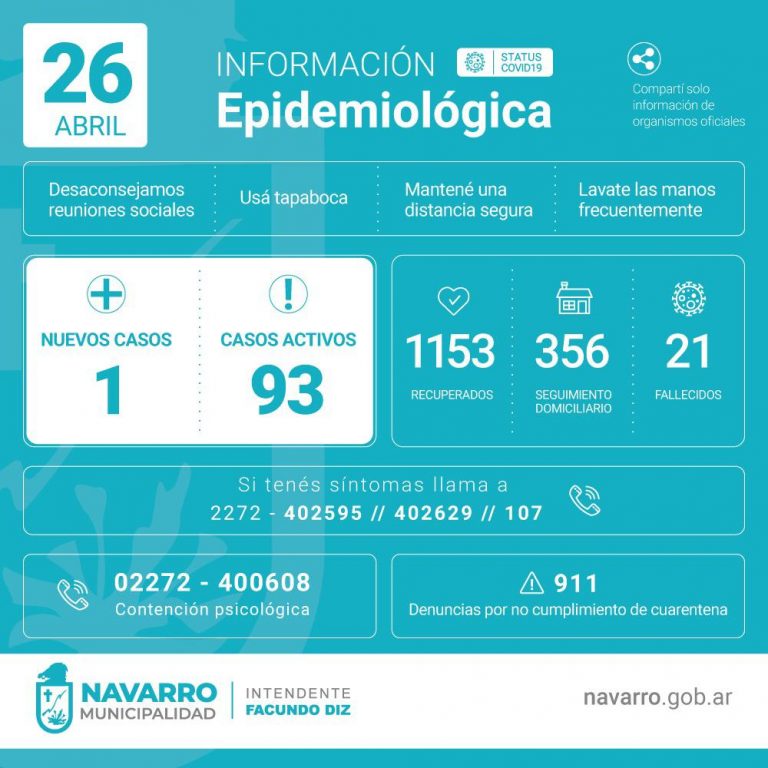 Hace minutos recibimos el informe epidemiológico diario. El mismo afortunadamente menciona nueve recuperados de alta y 1 sólo nuevo caso. Los activos descienden a 93.