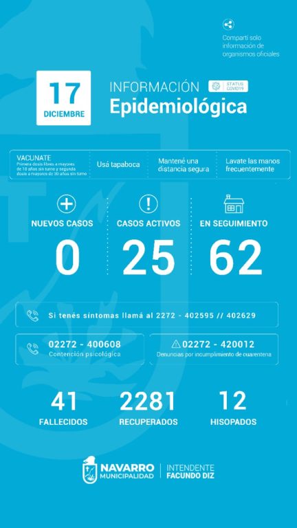 El último informe oficial acerca del estado de situación del COVID 19 en nuestra ciudad, indica que no hubo nuevos casos confirmados de COVID 19 y que los activos ascienden a 25.