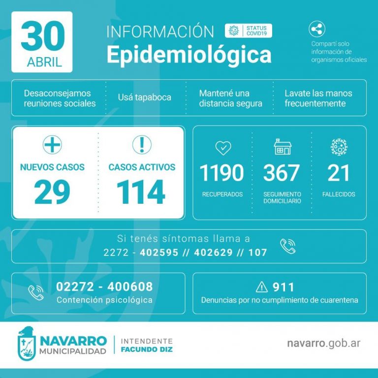 El último informe recibido, con el estado de situación del COVID en nuestra ciudad indica que hubo 29 nuevos casos. Se deduce también, que hubo 15 nuevas altas. El total de activos ahora es de 114.