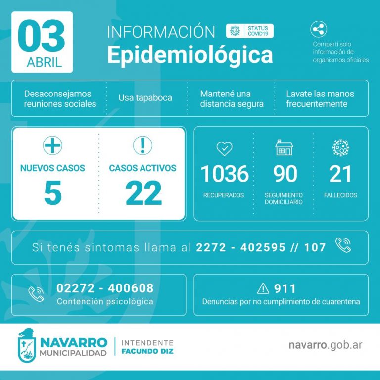 COVID 19. Estado de situación en Navarro al 03/04/21. 5 nuevos casos