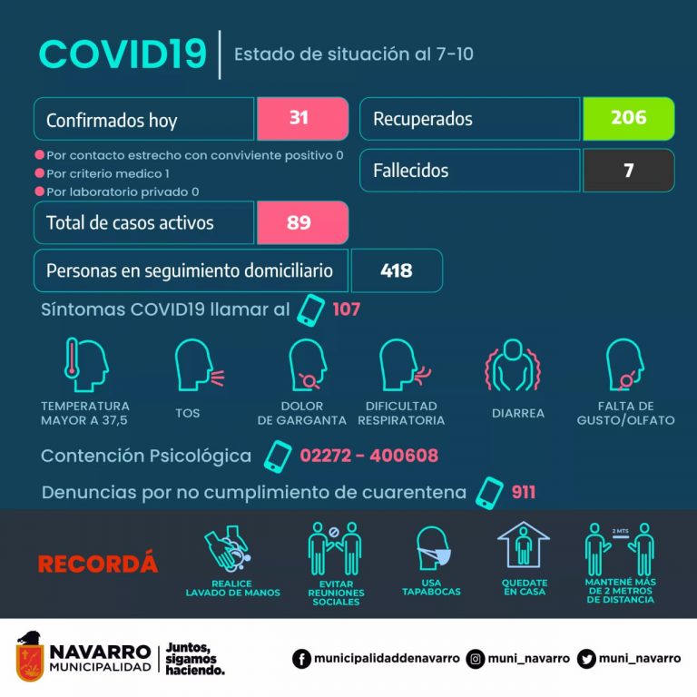 Hace unos minutos recibimos el informe con el estado de situación del COVID 19 en Navarro al 07/10/2020.