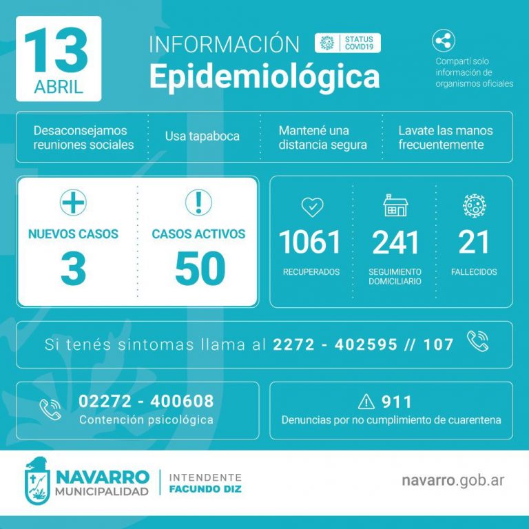 COVID 19. Estado de situación en Navarro al 13/04. 3 nuevos casos. Los activos son 50
