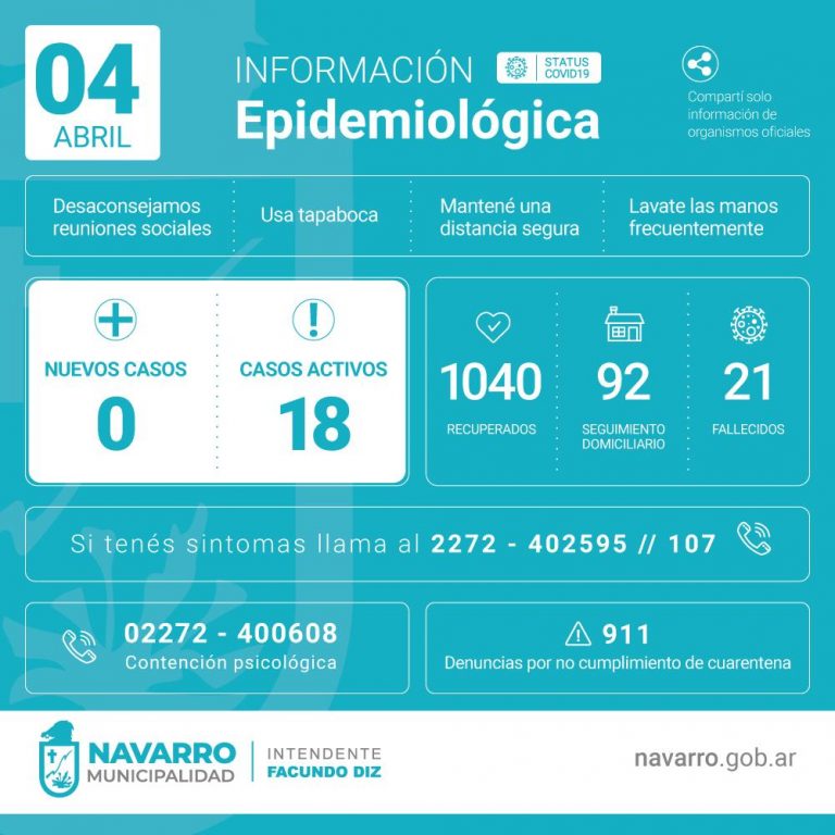 Hace minutos nada más, recibimos el parte oficial con el estado de situación del COVID 19 a la fecha en nuestra ciudad. El mismo indica que no hubo ningún caso nuevo y que al día de hoy los activos son sólo 18.