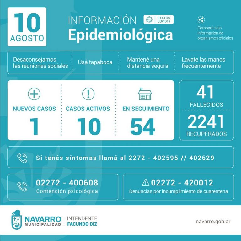 El informe oficial acerca del estado de situación del COVID 19 en nuestra ciudad a la fecha, indica que hubo 1 nuevo caso confirmado y que los casos activos descendieron a 10. También disminuyó la cantidad de personas en seguimiento; restan 54.