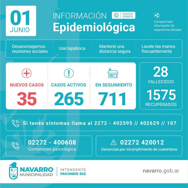 Ayer por la noche, recibimos en nuestra mesa de trabajo, el informe con el estado de situación del COVID 19 en Navarro al 01/06/21. Del mismo se deduce que hubo 9 recuperados de alta. También informan que se registraron 35 nuevos casos. El total de activos, por consiguiente, asciende a 265.