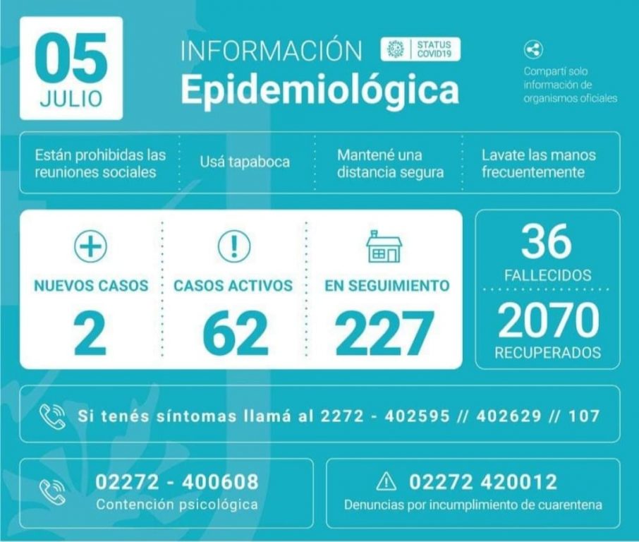 Y continúa la tendencia a la baja de casos en nuestra ciudad, en sintonía con el resto de la provincia. En el día de ayer, de acuerdo al informe oficial, hubo dos casos nuevos. A su vez, hubo 20 recuperados de alta, por lo que, los casos activos, descienden a 62.