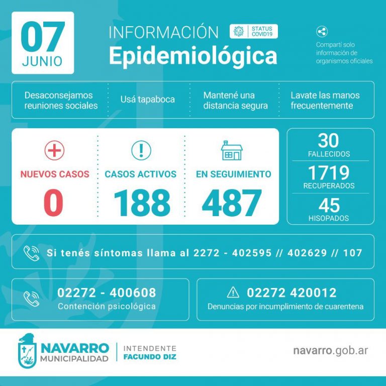 COVID 19. En la noche de ayer nos llegó la información oficial con respecto al estado de situación del COVID 19 en nuestra ciudad. De la misma se deduce que hubo 24 recuperados de alta y ningún caso nuevo. De este modo, los casos activos descendieron a 188.