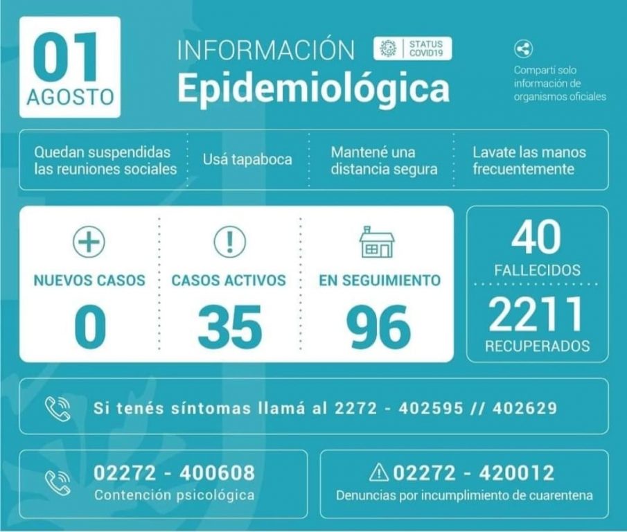 El informe oficial acerca del estado de situación del COVID 19 en nuestra ciudad, da cuenta de que no hubo ningún caso nuevo. Los casos activos son 35 y descendió el número de personas en seguimiento que al día de hoy suman 96.