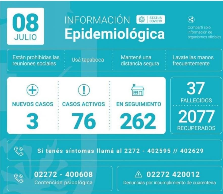 COVID 19. Situación en Navarro al 08/07. 3 nuevos casos. Los activos son 76