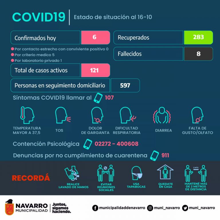 Hace minutos, recibimos en nuestra mesa de trabajo, el informe con el estado de situación del COVID 19 en Navarro a la fecha. Hubo 11 recuperados de alta. Además, hubo 6 nuevos casos. De este modo, el total de casos activos desciende a 121.