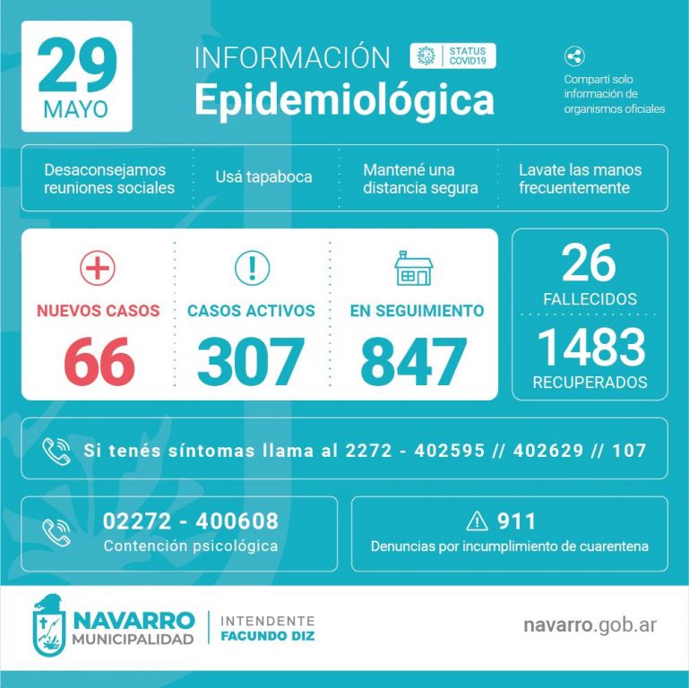 Ayer por la noche, recibimos el informe oficial con el estado de situación del COVID 19 al 29/05 en Navarro. Del mismo se deduce que hubo 16 recuperados. Informan además que hubo 66 nuevos casos, incrementando en 50 el total de activos que ahora asciende a 307.