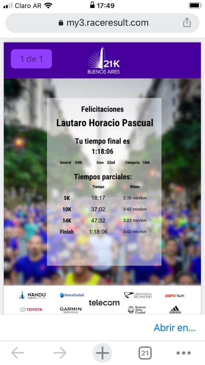 Pudimos contactarnos con algunos de ellos y nos manifestaron su satisfacción por haber terminado y por los tiempos obtenidos, especialmente Vero. Nos decía hace unos minutos: «Hola Guille, todo perfecto, hermosa la carrera, mis primeros 21 tan esperados, no sé exactamente los corredores, pero decían entre 10000 en los 21 y 4500 en los 42, estuvo hermoso y sé sufrió en los últimos 3 k, yo tardé 1:50:14, logré mi objetivo».