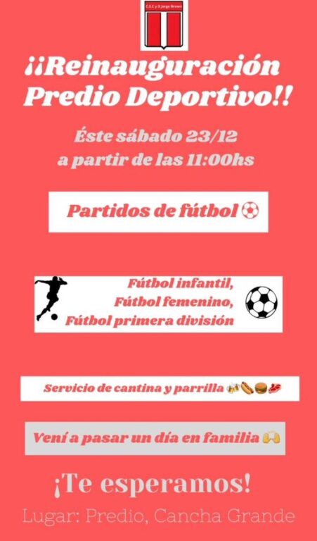 El club Jorge Brown de Villa Moll reinaugurará el próximo sábado 23, su cancha de fútbol. A partir de las 11 en su predio habrá diferentes actividades deportivas, como partidos de fútbol infantil, fútbol femenino y fútbol de primera división. Además habrá servicio de cantina y parrilla. Están todos invitados.