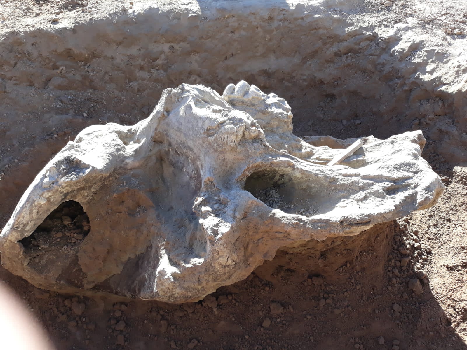 La Municipalidad de Navarro, a través de las Direcciones de Turismo y Cultura y el museo paleontológico Pampa Fósil, lamentan anunciar que fue encontrada rota in situ, una cabeza de mastodonte que había sido hallada en nuestro pueblo.