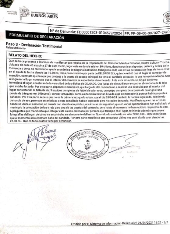 Nuevamente, tenemos que comunicarle a la comunidad una mala noticia. Lamentablemente, el día de ayer nuestro merendero, ubicado en el CIC, fue víctima de un robo y actos de vandalismo. Este es el tercer robo que sufrimos en menos de 2 meses y nos encontramos realmente desamparados. Rompieron el candado de la puerta para ingresar y sustrajeron del espacio material deportivo muy importante para las actividades que ofrecemos como conos, pelotas, entre otros. Además, destrozaron mercadería destinada a la asistencia alimentaria de 80 niños y niñas que concurren. Este merendero, es un espacio vital para nuestra comunidad, a la cual se le brinda un apoyo fundamental gracias al esfuerzo de personas solidarias que trabajan sin fines de lucro. Cada robo nos afecta significativamente, poniendo en riesgo el sostenimiento y la continuidad de nuestras actividades educativas, deportivas y culturales.
