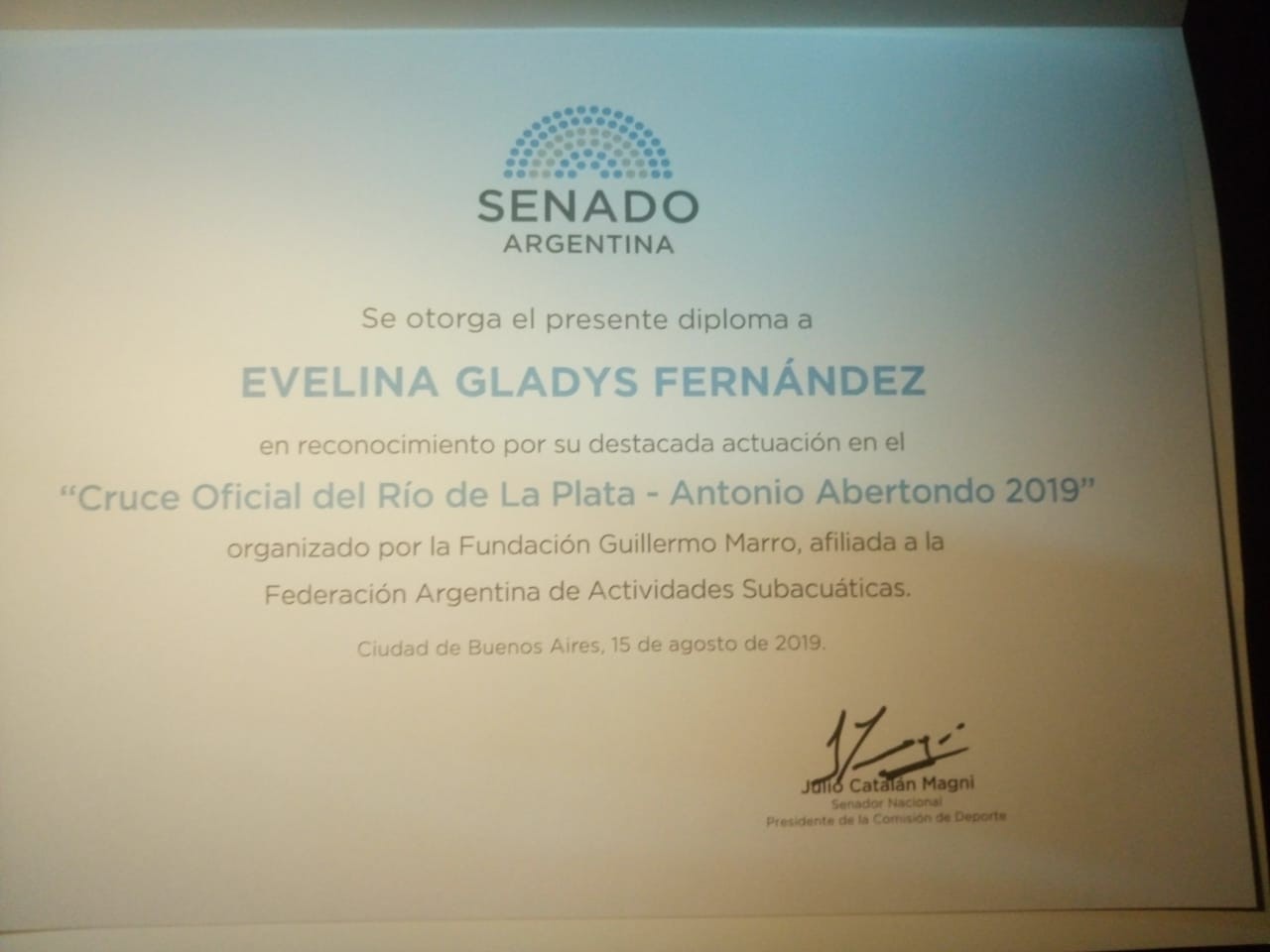 En el Salón de las Provincias del Congreso de la Nación, el Senado homenajeó esta tarde a los nadadores que cruzaron a nado el Río de La Plata hace unos meses nada más. Gladys Fernández fue reconocida como ya lo había sido en la Legislatura Porteña.