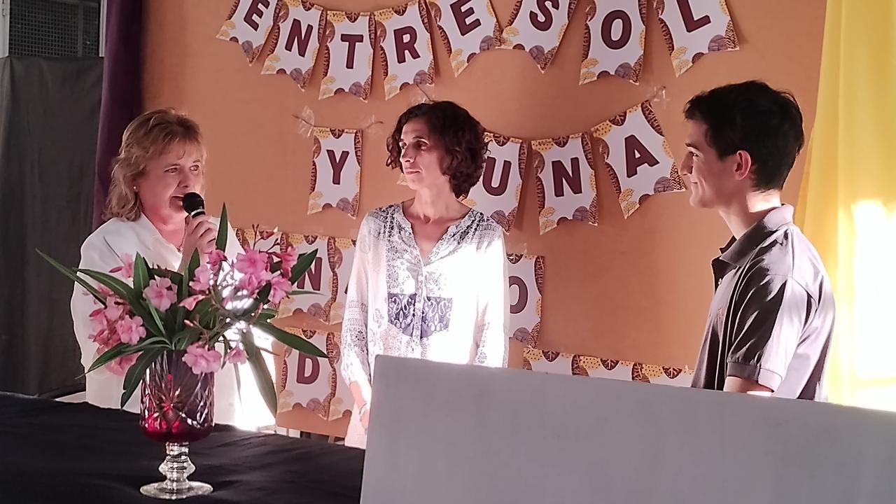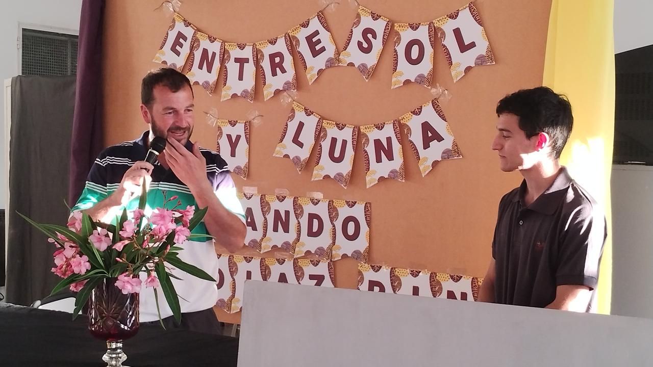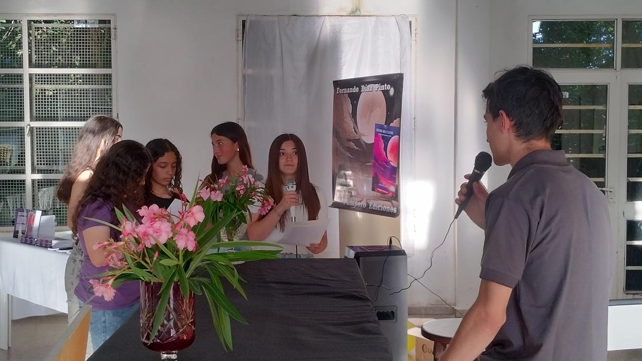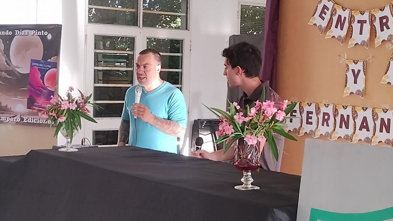 Tal como adelantáramos se realizó ayer en la E.E.S. Nº 5 de J.J. Almeyra, la presentación del libro de Fernando Díaz Pinto, «Entre Sol y Luna». En el acto realizado a partir de las 17, estuvieron presentes familiares, amigos, autoridades de la escuela, la Inspectora Gabriela de la Cuesta, la editora que colaboró para que hoy sea una realidad, ex profesores, gente de la Biblioteca Almafuerte y medios de prensa. El talentoso joven se mostró muy agradecido, contestó preguntas, firmó ejemplares y escuchó con atención y no menos emoción, las alocuciones de los presentes entre las que se destacó la de la señora Sara Hirigoyen, autora del prólogo.