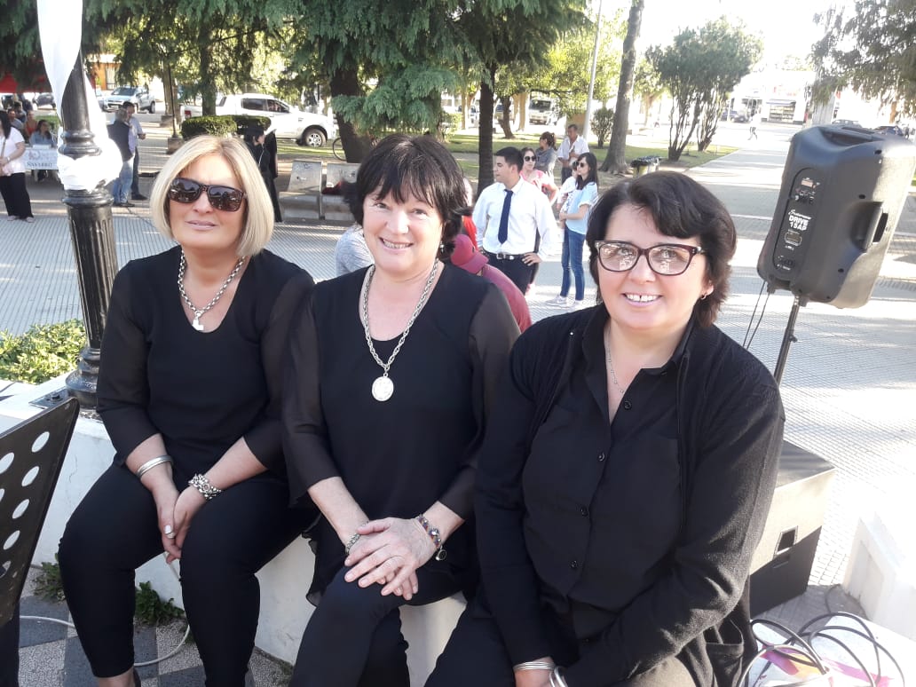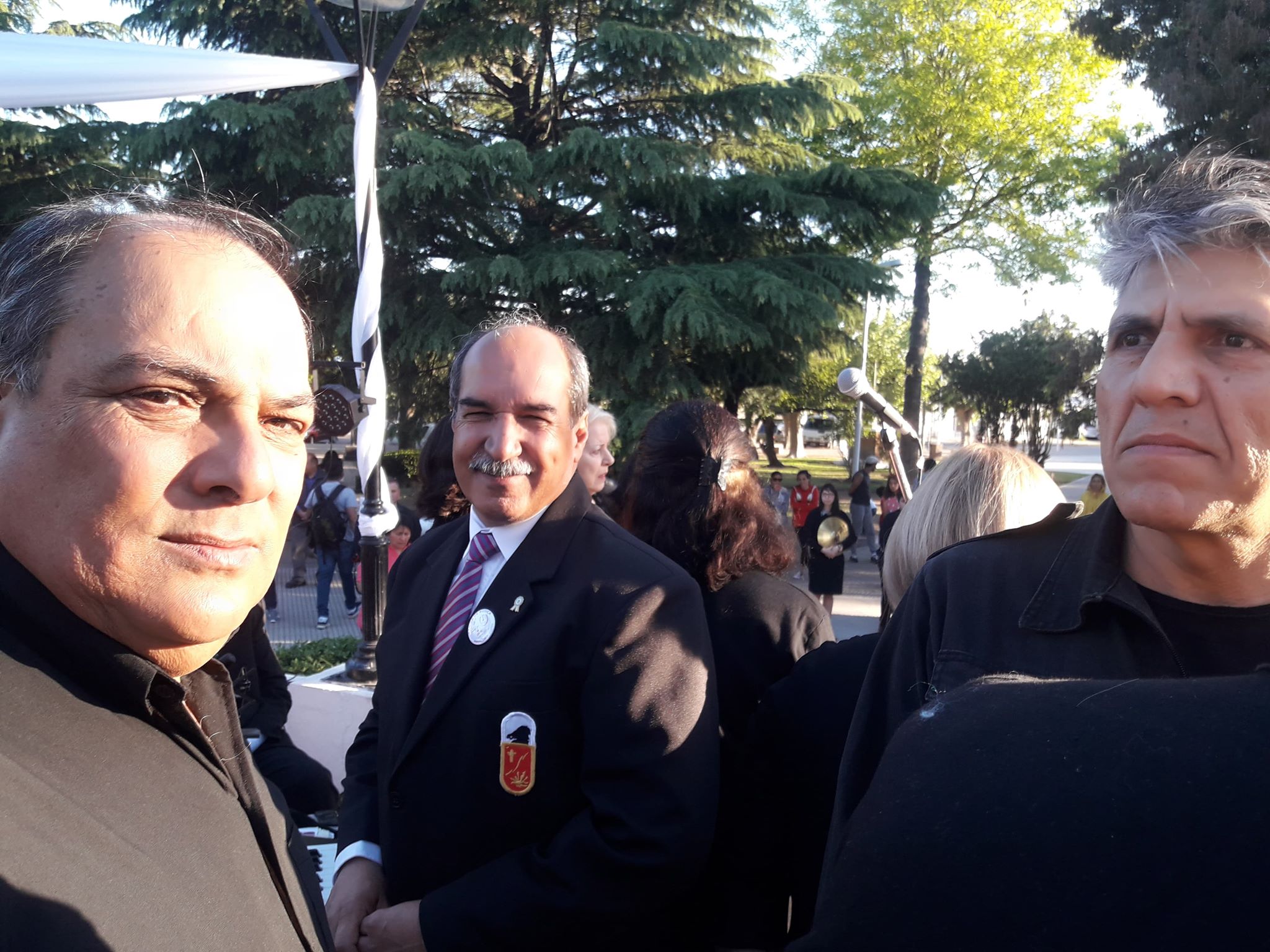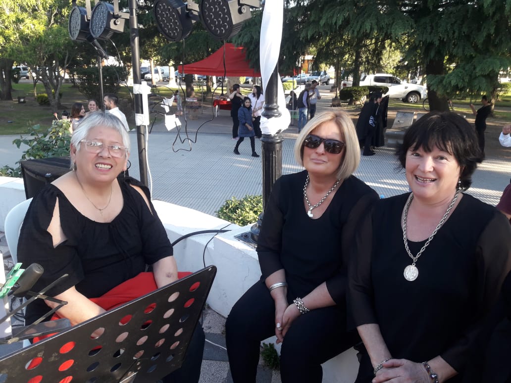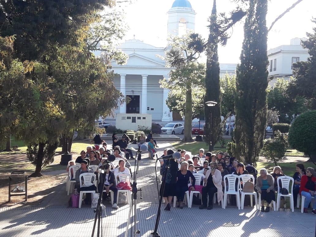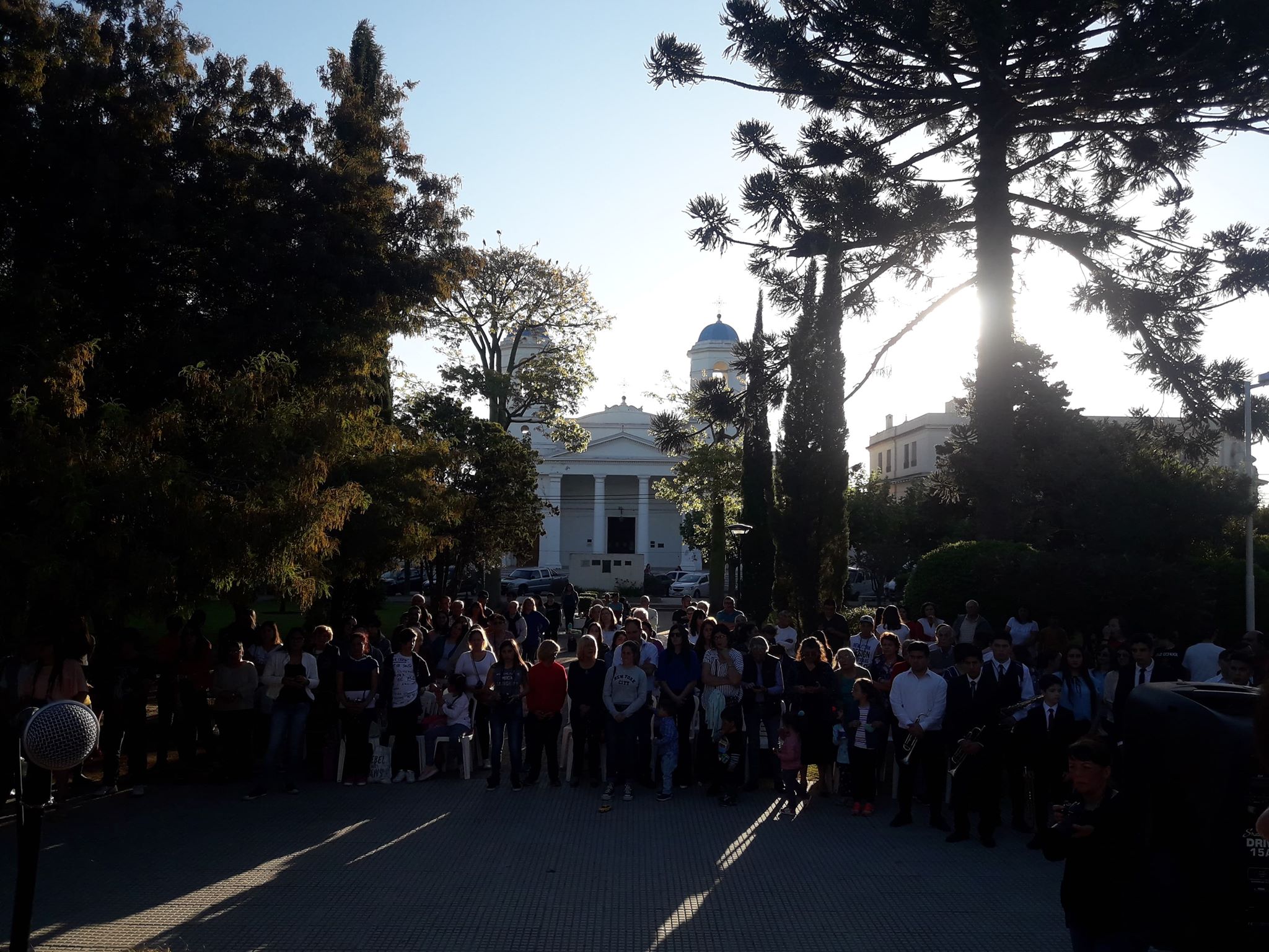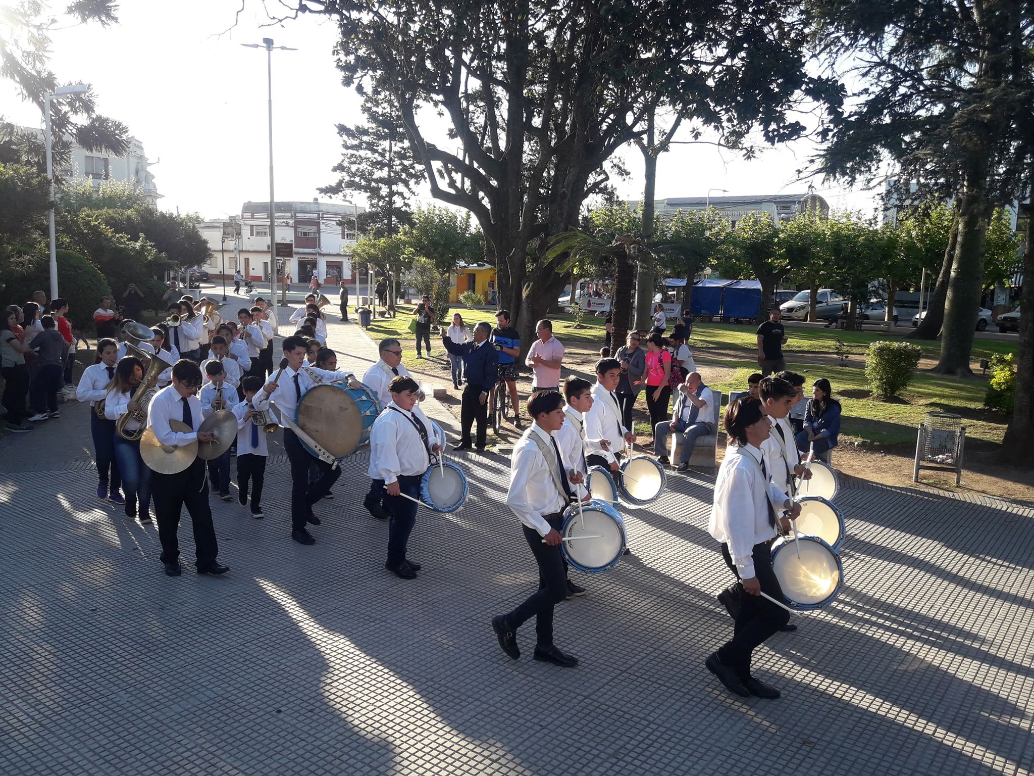 Las bandas vinieron desfilando e ingresaron por cada una de las cuatro esquinas de la plaza. Una vez todas juntas, se entonó el Himno Nacional Argentino y luego el clásico «Felíz Cumpleaños».
