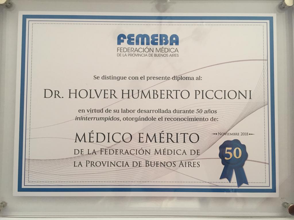 La Federación Médica de la Pcia. de Bs. As. (FEMEBA), en su sede de la ciudad de las diagonales, reconoció esta tarde al Dr. Holver Piccioni por su medio siglo de trayectoria como profesional de la salud.