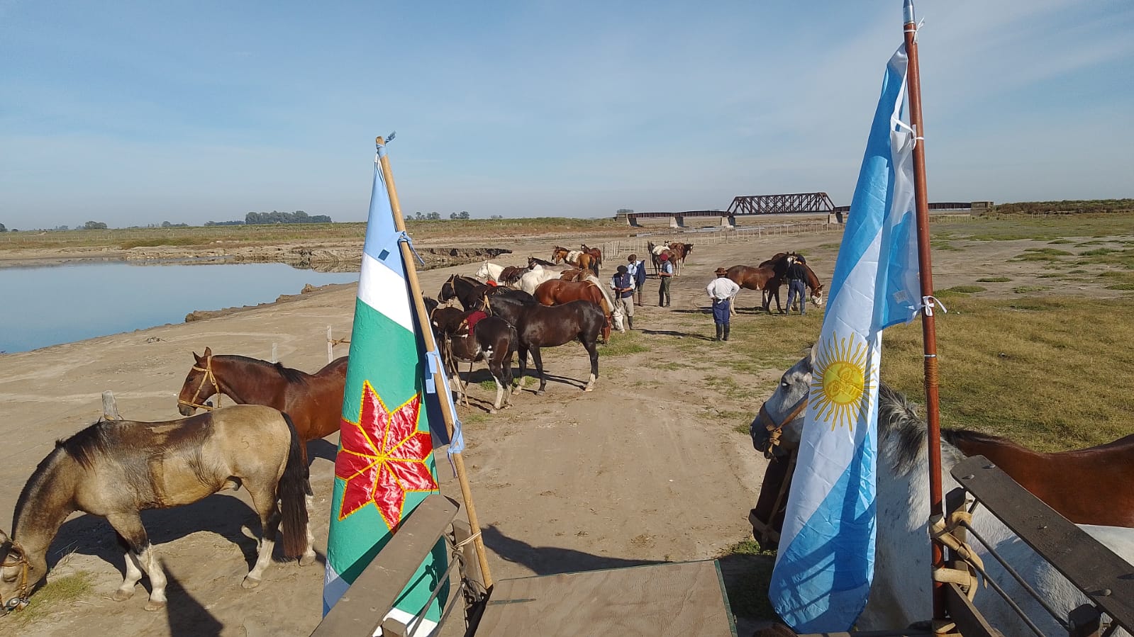 El jueves 27 debieron partir hacia Ramón Biaus donde a mitad de trayecto se iba a vivir uno de los momentos más relevantes de la marcha y también el de más zozobra. Debieron desviar por un camino por sobre las vías, que están empedradas para el paso alternativo de vehículos; este trayecto los llevó hasta el puente del tren que cruza el Salado, las postales y la experiencia fueron increíbles. Pero la zozobra se hizo presente cuando huvo que defender un barranco con la chata de campaña. Hubo que cuartearla de la culata como en las viejas épocas, a cincha de caballo. Todo salió bien y quedaron sólo las anécdotas y no el momento. Ahí mismo, a orillas del salado almorzaron antes de llegar a Biaus.