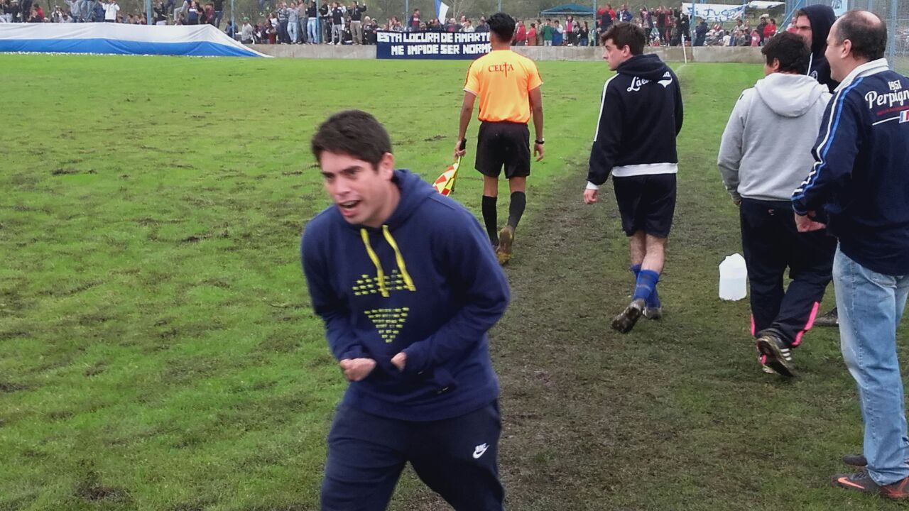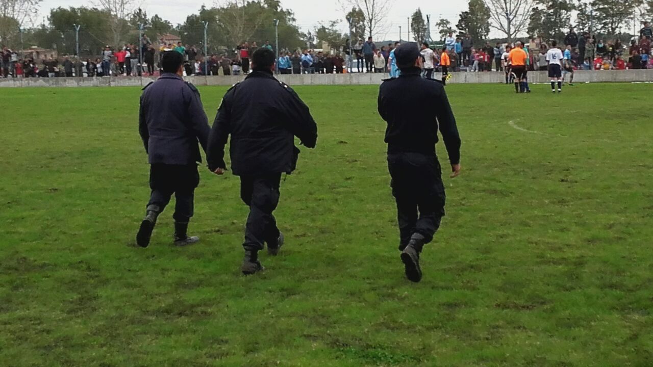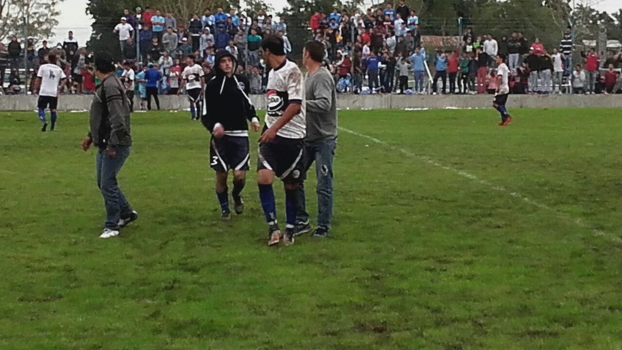 En el segundo tiempo E.F.I.N., hizo dos cambios: ingresaron Luchy Derbis y Carli Torres, por Agustín Cerdá y Leandro Breccia. Chotro pasó al fondo y desde allí manejó los hilos de un E.F.I.N. que empezó a mejorar, aprovechando el quedo de Dorrego. Muy bien Derbis que generó por su banda lo mejor del azul en este lapso. En una jugada de contragolpe para Dorrego, expulsan al arquero de E.F.I.N., que quedó como último hombre en una jugada algo confusa, ya que el árbitro y el juez de línea no se ponían de acuerdo en lo que cobrar. Allí vino, muy por el contrario de lo esperado, lo mejor de E.F.I.N. y lo peor de Dorrego. Tuvo que salir Franco Rivas, e ingresar al arco Claudio Breccia, pero los celestes no sabían como aprovechar la ventaja que les otorgaba el hombre demás. Y es así como Facundo Vera, puso las cosas 1 a 1, luego de un centro de Derbis, que peinara Carli Torres. Salió Matías García lesionado y muy cansado en Dorrego y en su lugar ingresó Anduch. Cambios de los dos lados. Jhony Novas por Leonardo Ferzzola en Dorrego y en E,F,I,N,, ingresa Jonathan Algañaraz por Diego Lettieri lesionado. Luego Santiago Traboni ingresó por Mussi Manzor en los celestes. Partido friccionadísimo, ánimos exaltados. El árbitro amonesta a Bastarrechea. Poco para decir del encuentro. El partido se juega más en las tribunas y en los bancos. Luego de una pelota llovida de derecha a izquierda, Santiago Traboni, puso de cabeza el 2 a 1 para los celestes de la calle 22. Quedaba poco. La tensión iba en aumento, y luego de una falta de Chotro empezaron las discusiones, los forcejeos, los empujones, ingresó personal policial y el árbitro, de muy mala actuación, decidió suspender el partido, cuando sólo restaban los minutos adicionados (según él mismo me lo indicara luego). Iba a decir que esto empañó la fiesta, pero no puedo decirlo porque realmente, no hubo fiesta. Los motivos, los analizaremos con más detenimiento. Sólo vimos un partido chato, friccionado, muy hablado, y con el peor de los finales. Las figuras: para mí Nicasio Vicente y Santana por el lado de Dorrego. En E.F.I.N., la distribución de Federico Chotro en el primer tiempo y algunos destellos de la calidad de Diego Lettieri; y muy poco más. 3 puntos de oro para Dorrego, que debe ganar todo o casi todo lo que falta. Si eso no ocurriera, podría jugar en la zona B, al finalizar esta ronda. Brillantes los relatos y comentarios de Sporttime y gran cantidad de gente alentando a ambos equipos, como dato anecdótico. Les dejamos algunas imágenes de lo ocurrido esta tarde en el predio de Dorrego.
