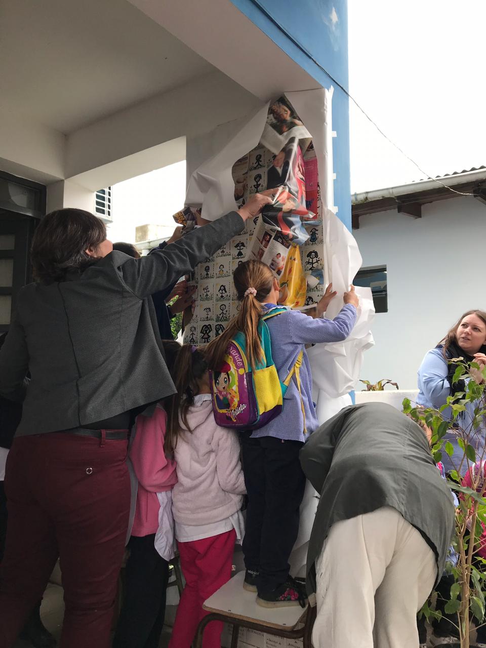 Dentro de las actividades de la semana del C.E.C., la Escuelita del Arte de Yoli Santía, fue invitada a participar con un trabajo en conjunto realizado por alumnos, maestros y familia. La propuesta de Yoli, junto a Marcela Abaunz, no tardó en llegar. Ofrecieron realizar un trabajo que perdure en el tiempo. Y así fue, que hoy a las 12,30 en las instalaciones del C.E.C., se inauguró un mural realizado por los chicos con la ayuda de la escuelita.